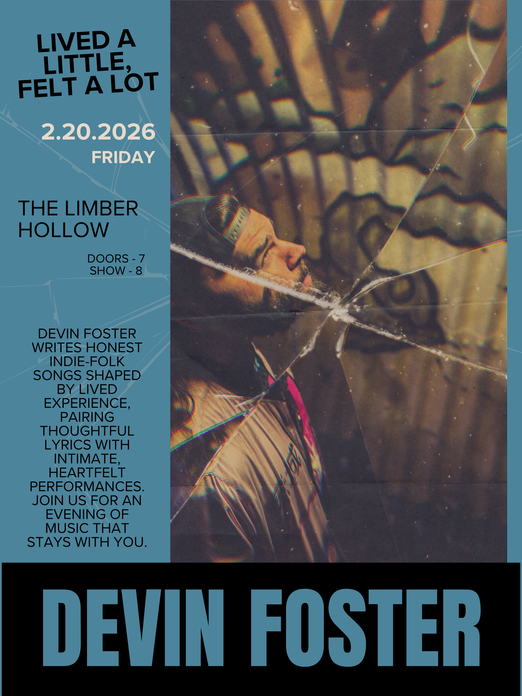 Join us for a cozy, intimate night of live music featuring Devin Foster, a Calgary-based singer-songwriter known for honest indie-folk songs shaped by lived experience. With thoughtful lyrics and heartfelt performances, Devin’s music is best heard in a room where people come to listen.